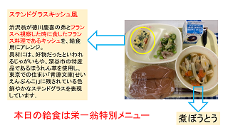 全校朝会ではでは、栄一翁の生き方について論語から子曰く、「君子は義に喩(さと)り、小人 (しょうじん)は利に喩る」→「行動にさいして、義を優先させるのが君子、利を優先させるのは小人である」◇栄一翁と明戸地区との密接な関係があった→藍玉番付表には30家そのうち明戸地区はそのうち10家といった内容でした。給食は「栄一翁追悼献立」でした。煮ぼうとうは、栄一翁が地元に帰るたび好んで食べていたといわれる郷土料理。また、フランス料理であるキッシュを給食風にアレンジし、好物だったといわれるじゃがいも、深谷市の特産品であるほうれん草を使用し、色鮮やかなステンドグラスを表現した1品。