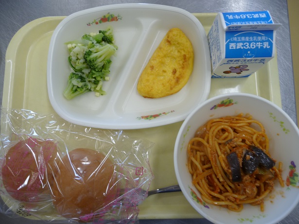 今日のおすすめは「秋なすの和風ボロネーゼ」でした。秋なすは水分が多く、皮が柔らかいのが特徴で今日のトマトベースの味が良くしみており、「給食でこの味が食べられるのがすごい!}ととても好評でした。食べ残こしもほぼなかったです。