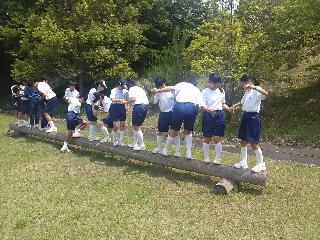 1,2年生全員が4つの班に分かれて、森のキャンパスアドベンチャーコースに挑戦中です。