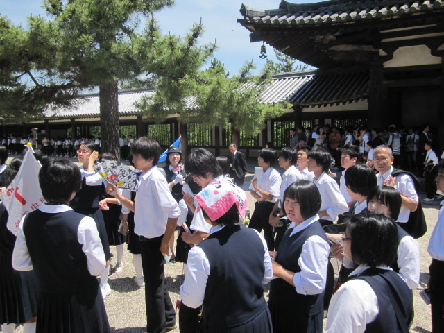 厳粛な雰囲気の中の、国宝「金堂」での朝のお勤め見学に始まった2日目。時間をかけて準備してきた「班別自主見学」も、無事終了しました。若干の予定変更もありましたが、どの班もほぼ計画通り、基本の計画に微修正を加えながら、協力し合い支え合い励ましあ合い、心に残る思い出を、たくさんたくさん作れたようです。だいぶ疲れていますが、明日はもう深谷に帰ります。長い準備期間でしたが、始まってしまえば本当に”あっという間”。全員で元気に、帰宅できそうです。では、2日目、報告します。【朝のお勤め見学&境内貸切散策】 【朝食】 【班別自主見学】 【夕食・・・すき焼き】 【班別行動報告会】 【仁和寺の様子&北野天満宮絵馬】