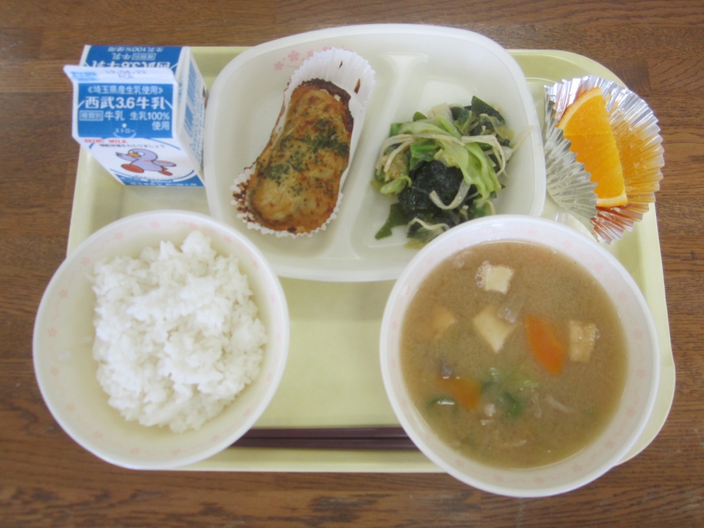 牛乳・ごはん・星のハンバーグ・キャベツのペペロンチーノ風・かき玉汁・クリスマスセレクトケーキ