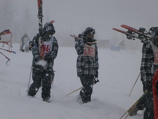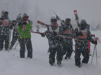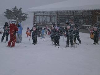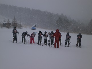 吹雪のためリフトは中止で、センターロッジ前の広場でどの班も練習を開始しました。横なぶりの雪が顔に当たって冷たいのですが、少しずつ滑れるようになって行く生徒を見ていると、上達の早さに驚きます。