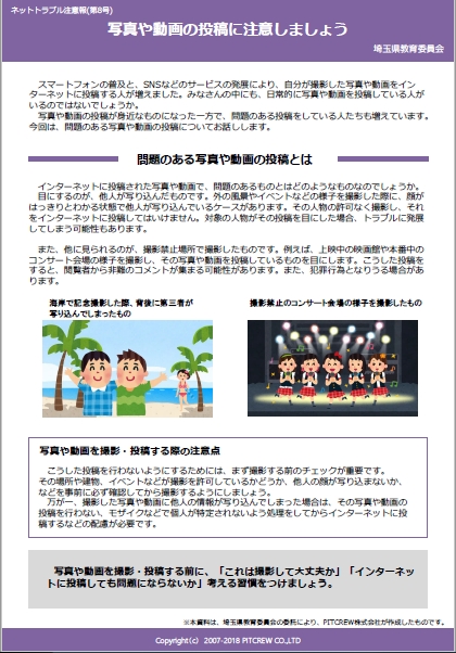 今回はネット上に投稿された、写真や動画に、どんな問題が生じるのか等、その注意点について書かれています。今後のご指導の参考にしてください。