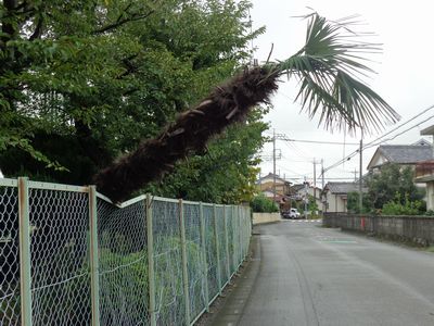 昨日、西日本を横断した台風21号は各地に大きな被害を与えました。明戸中においても、昨日は強風で正門が動かされ、門を留めておく木の棒が折れてしまいまい、一晩中門は開けっ放しの状態になってしまいました。また、今朝登校して校舎内外を点検したところ、自転車置き場の東側のトウジュロの木が強風で倒されていました。倒れてしまったトウジュロの木は、やむを得ず根元から伐採することになりました。