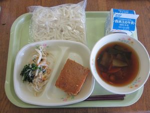 牛乳・ごはん・タラの南蛮漬け・ひじきのそぼろ炒め・ジャガイモと小松菜のみそ汁