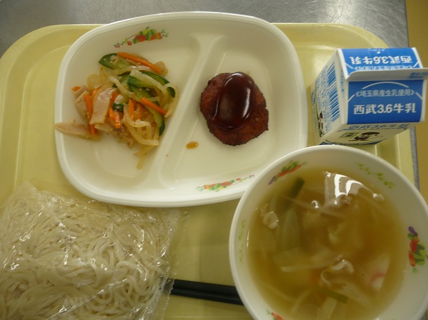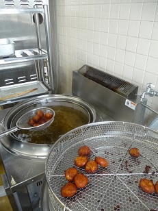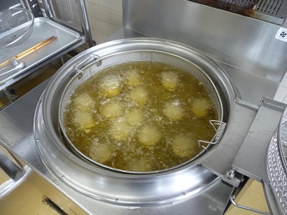 今日のおかずは、北海道の郷土料理の「いももち」でした。明治時代の北海道の開拓時代に米作が困難だったため、米のかわりにじゃがいもで餅を作ったことから作られるようになりました。給食では、小判型に1個1個丸めて150℃で表面がカリッとなるまで揚げ、甘いたれをかけて食べました。