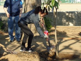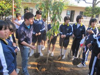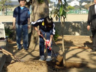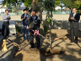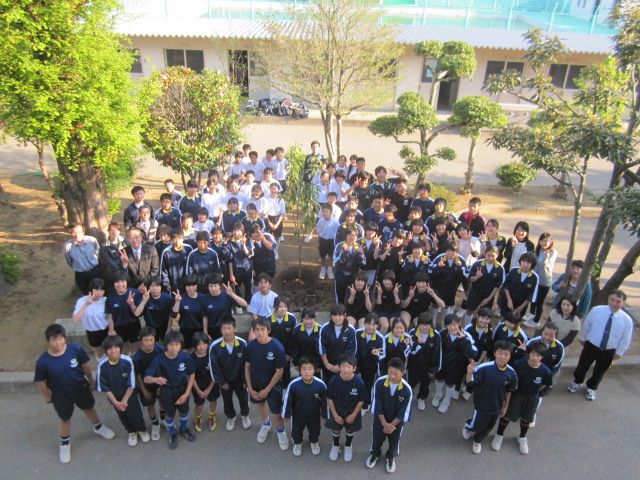 当日は、はじめに明戸学校支援地域本部の山本本部長様、髙野コーディネーター様、髙野生徒会緑化委員長、校長が土をかけました。その後、校長、緑化委員長の挨拶の後、山本本部長からお話をいただきました。そして最後に記念撮影をしました。