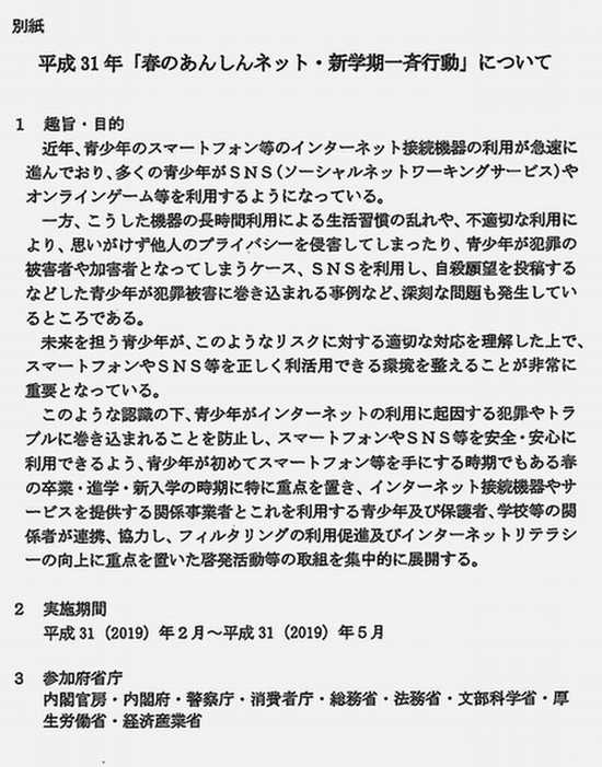 そこで、関係各機関が参加協力し、子供達が初めてスマートフォン等を手にする時期でもある、この春の卒業・進学・新入学シーズンにタイトルのような啓発活動を推進します。スマートフォン等が代表する、これらのネット機器は、所持する者に、厳しい管理責任を問い、まだまだ未成熟な中学生に、その責任を持たせることは難しいことであることを理解してほしいと思います。あくまでも、学校としてはその所持を推奨していません。