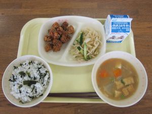 コーヒーミルク・カレーピラフドリア風・フライドチキン・クリスマスサラダ・野菜コンソメスープ