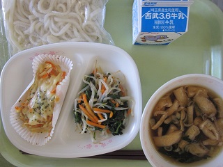 牛乳・ごはん・えごまふりかけ・じゃが豚キムチ・厚焼き卵・ツナとひじきのサラダ