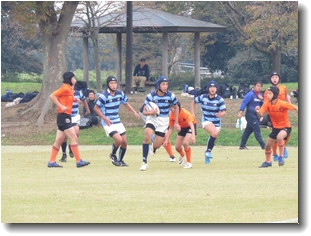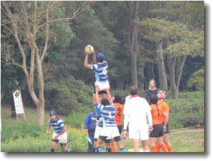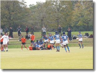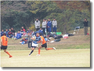 11/4(日)、ラグビー部が新人戦県大会一回戦に臨んだ。初めての県大会、緊張し、やや硬い表情で、試合が始まった。試合展開は、前評判以上に、熊谷富士見中の強さと大きさに戸惑いながら、表情通りの硬く、ぎこちない試合運びになってしまった。さらに、悪いことに開始5分で、部長が負傷により途中離脱、一回戦の勝利に赤信号がともった。