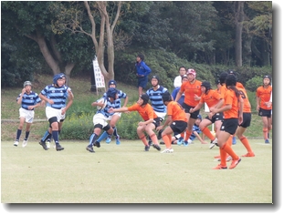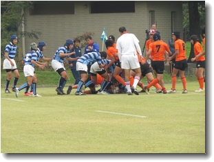 ただ、その後の明中12名の集中は素晴らしかった。部長を欠きながら、全員一丸となり、サイズの大きな富士見中ラグビー部の突進を足下への低い、必死のタックルで止める努力を試みた。試合は一進一退の展開になり、トライを取って、取られてのシーソーゲームになった。