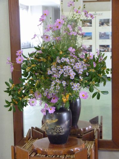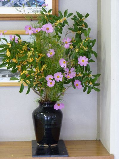 玄関の花をリニューアルしました。今回はコスモスとキンモクセイなどが飾られました。