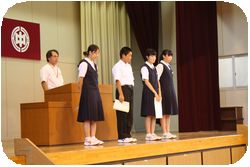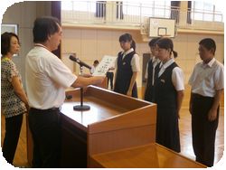 始業式後は表彰が行われました。夏季バドミントン大会と深谷市人権作文の表彰でした。