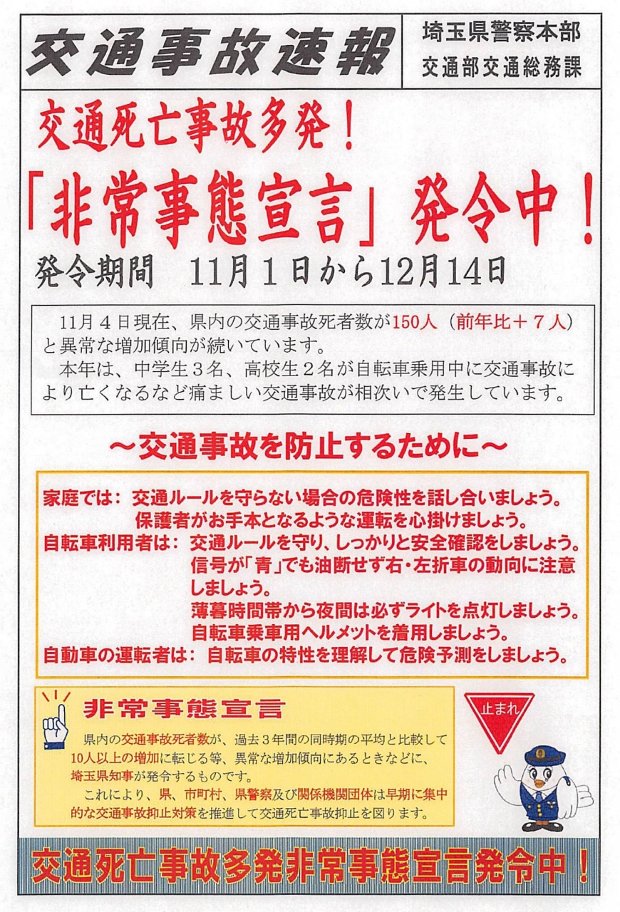 県内では交通死亡事故が多発し、11月1日には知事から「交通死亡事故多発非常事態宣言」が発令されるなど、極めて深刻な状況が続いています。このような中、本庄では中学生が亡くなる死亡事故、深谷市内でも、小学生の命に関わるような交通事故が発生しています。
