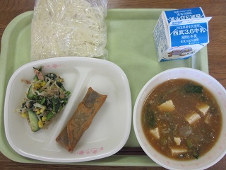 牛乳・麻婆ラーメン・お揚げのサラダ・彩の国肉まん・はちみつゆずゼリー