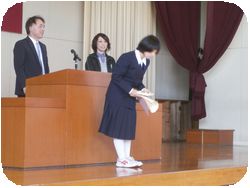 1年の庄田さんが15日に花園アドニスで行われた人権セミナーにて発表した「差別のない社会」の作文を発表しました。