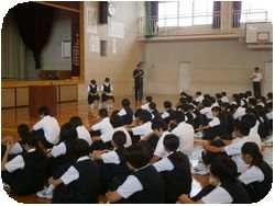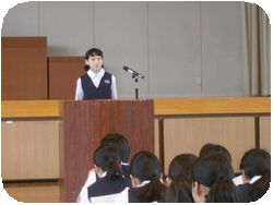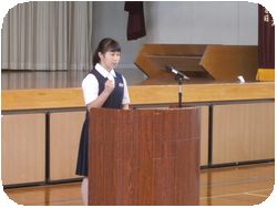 明日行われる英語スピーチコンテストに出場する、2年の石川さんと3年の辻本さんの英語スピーチが全校生徒の前で行われました。最後に校長先生からの講評も英語で行われて、英語ずくめの1日のスタートです。