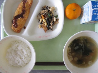 牛乳・ごはん・タラのねぎマヨポン焼き・生揚げのチャオサイ・けんちん汁