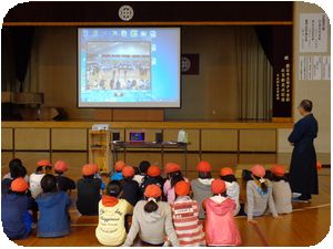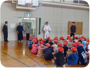 明戸小学校6年生が武道体験の授業のために、明戸中学校に来ました。体育館で剣道、武道場で柔道の体験授業を受けます。柔道の講師は明戸中学校校長の青木校長先生が担当しました。