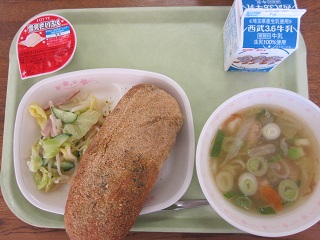 牛乳・麻婆ラーメン・お揚げのサラダ・彩の国肉まん・はちみつゆずゼリー