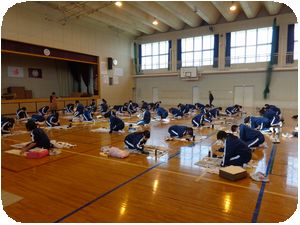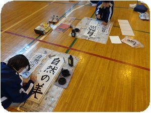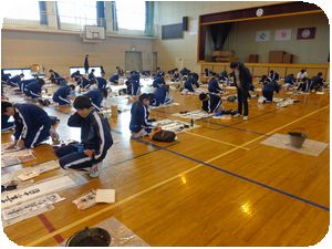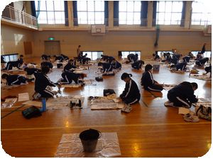 明中では時間割を変更して全学年一斉に体育館で練習をしています。一言もしゃべらず1時間集中して作品を書き上げます。体育館の中がまるで別空間のようでした。