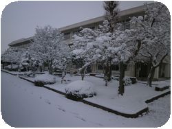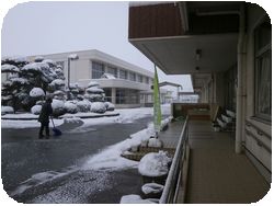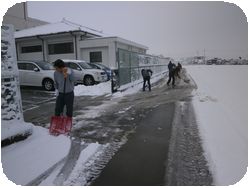 2時間遅れで授業開始なので、職員が生徒が登校する前に敷地内の雪かきをしました。