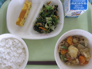 牛乳・ごはん・えごまふりかけ・じゃが豚キムチ・厚焼き卵・ツナとひじきのサラダ