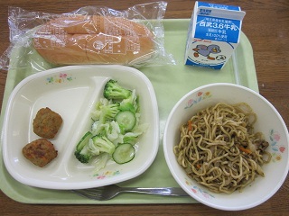 今日は人気メニューの焼きそばが登場しました!また、今日のコッペパンには切り込みが入っていたので焼きそばをはさんで「焼きそばパン」として食べることもできます!皆それぞれの好みでパンと別々に食べたり、はさんで食べたり楽しんでいたようです。