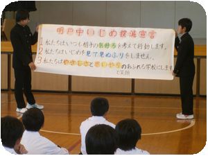 生徒会がつくった「明戸中いじめ撲滅宣言」検定を全校で取り組みました。この「撲滅宣言」を意識して生活して、今日もいじめのゼロの明戸中を続けましょう。