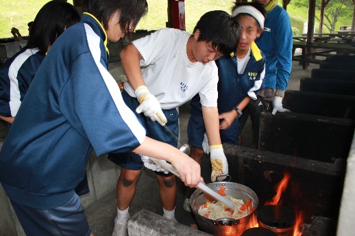 爨[はんごうすいさん]では、班員が協力して「カレーライス」を作りました。どの