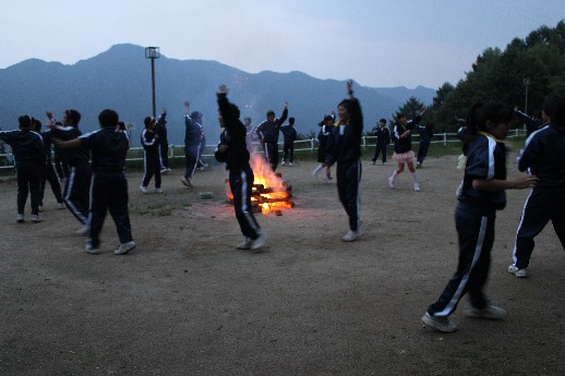 キャンプファイヤーでは、大いに盛り上がりました。少し雨が降ってきて、心配