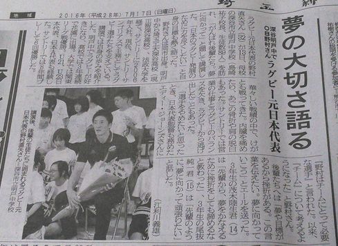 ラグビー元日本代表の野村直矢さんを迎えて行われた、ふれあい講演会の様子や、2人の生徒の感想などが紹介されています。