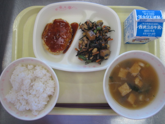 どれが大豆からできている食べ物か皆さんわかりましたか?おかずの煮物の中には『大豆』、ハンバーグには、『豆腐』、野菜椀の中には『生揚げ』『みそ』が使われていました。