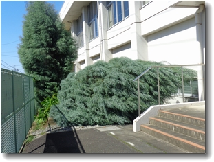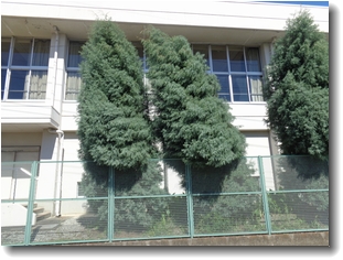 先日の9/30(日)から10/1(月)未明にかけて吹き荒れた台風24号により、明戸中の樹木に被害がありました。体育館の南側にあった6本のアリゾナスギの内、一本が根こそぎ、倒れ、もう一本も傾いています。他の4本も不安定の状態であり、この6本は切らなければいけない状況です。とても、残念のことですが、ご理解いただければと思います。