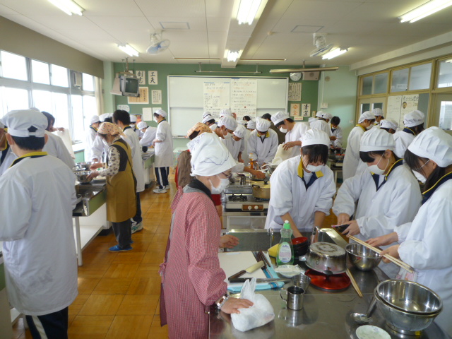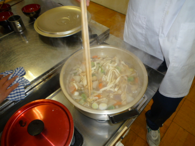 1月25日の第5・6校時に、2年1組の生徒が調理実習で”煮ぼうとう”をつくり