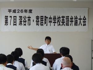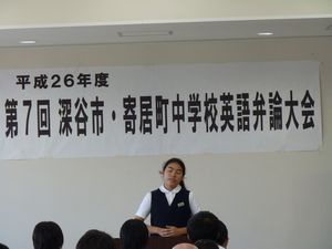 平成26年9月9日に深谷市・寄居町英語弁論大会が行われました。本校を代表して、3年渡邊君と為谷さんが出場しました。渡邊君は「About my new school days」為谷さんは「My dog, my friend」というタイトルで弁論しました。先日、学校でのリハーサルと同じように、二人ともスムーズに落ち着いて見事にやり遂げました。大変立派でした。