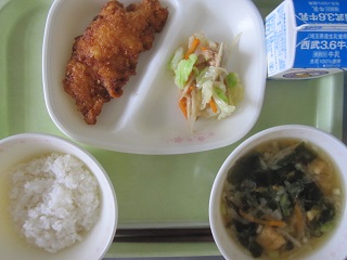 牛乳・スピナッチカレー・大豆とレンコンのカリカリ揚げ・大根とジャコのサラダ・ヨーグルト