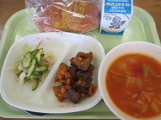 コーヒーミルク・カレーピラフドリア風・フライドチキン・クリスマスサラダ・野菜コンソメスープ