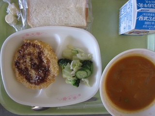 牛乳・エビカツバーガー・シルクサラダ・煮ぼうとう