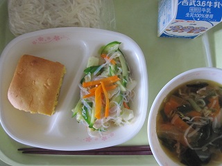 牛乳・ごはん・えごまふりかけ・じゃが豚キムチ・厚焼き卵・ツナとひじきのサラダ