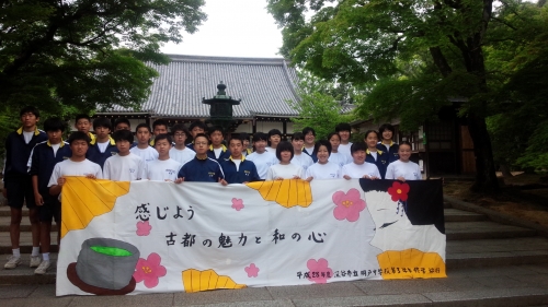 朝のお勤め体験終わりました。記念撮影です。今の仁和寺には明戸中生徒とお坊さんしか居ないそうです。世界遺産貸切です。貴重な体験。