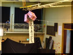四角いくす玉を割るとき紐が1本切れるアクシデント発生。でも、なんとか垂れ幕を下ろしました。