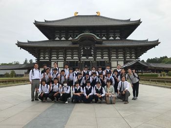 『15:38分、東大寺にやってきました。大仏殿をバックに集合写真を撮りました。奇跡的に、周りに人がいません。』
