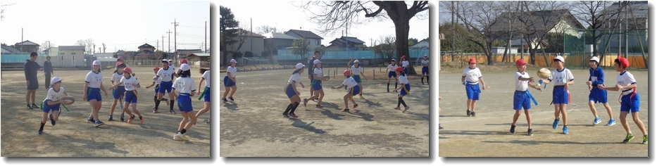授業は保健体育、内容はタグラグビーを行いました。タグを取り合う、鬼ごっこから、最後はグループに分かれて、タグラグビーの試合まで、