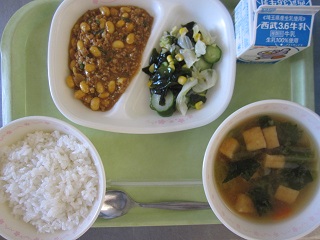 牛乳・ごはん・えごまふりかけ・じゃが豚キムチ・厚焼き卵・ツナとひじきのサラダ