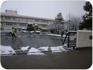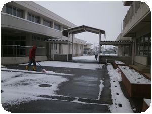 前回同様、生徒が登校する前に職員で雪かきをして安全に敷地内を移動できるように対応しました。今日は防災訓練も6校時にあります。外が使えないので体育館を使って訓練をする予定です。