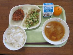 牛乳・ごはん・韓国風鶏の照り焼き・パリパリサラダ・トックスープ
