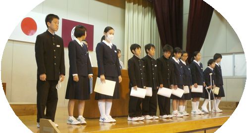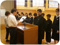 新人戦陸上の1500m,3000m、人権作文の表彰、大里地区発明創意くふう展、埼玉県科学教育振興会大里地区展などの表彰がおこなわれました。さまざまな分野で明中の生徒が活躍しています。