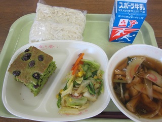 牛乳・ごはん・星のハンバーグ・キャベツのペペロンチーノ風・かき玉汁・クリスマスセレクトケーキ
